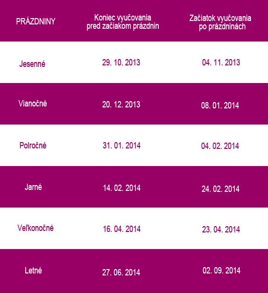 Školský rok 2013/2014 sa začína 1. septembra 2013. Školské vyučovanie sa začína 2. septembra 2013. Vyučovanie podľa rozvrhu hodín sa začne 3. septembra 2013. Školské vyučovanie v prvom polroku školského roka sa končí 31. januára 2014 (piatok). Školské vyučovanie v druhom polroku sa začne 4. februára 2014 (utorok) a končí sa 27. júna 2014 (piatok).